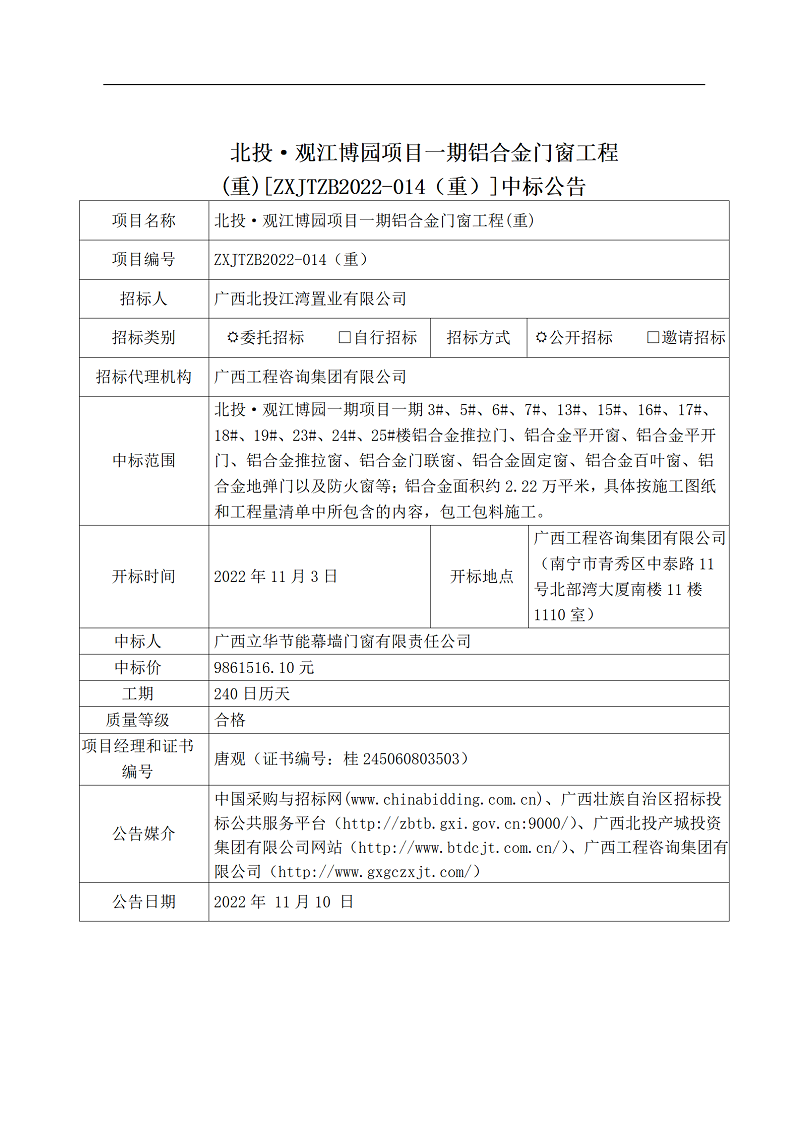 北投·觀江博園項(xiàng)目一期鋁合金門(mén)窗工程(重)[ZXJTZB2022-014(重)]中標(biāo)公告
