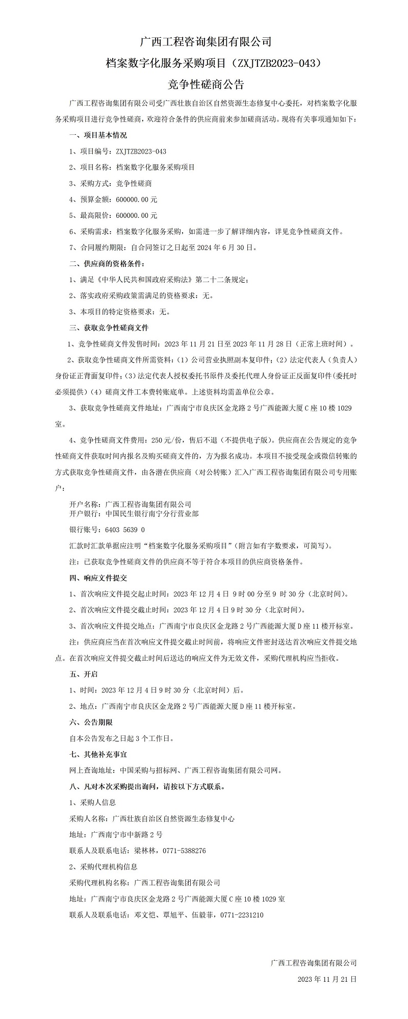 廣西工程咨詢集團(tuán)有限公司檔案數(shù)字化服務(wù)采購(gòu)項(xiàng)目(ZXJTZB2023-043)競(jìng)爭(zhēng)性磋商公告