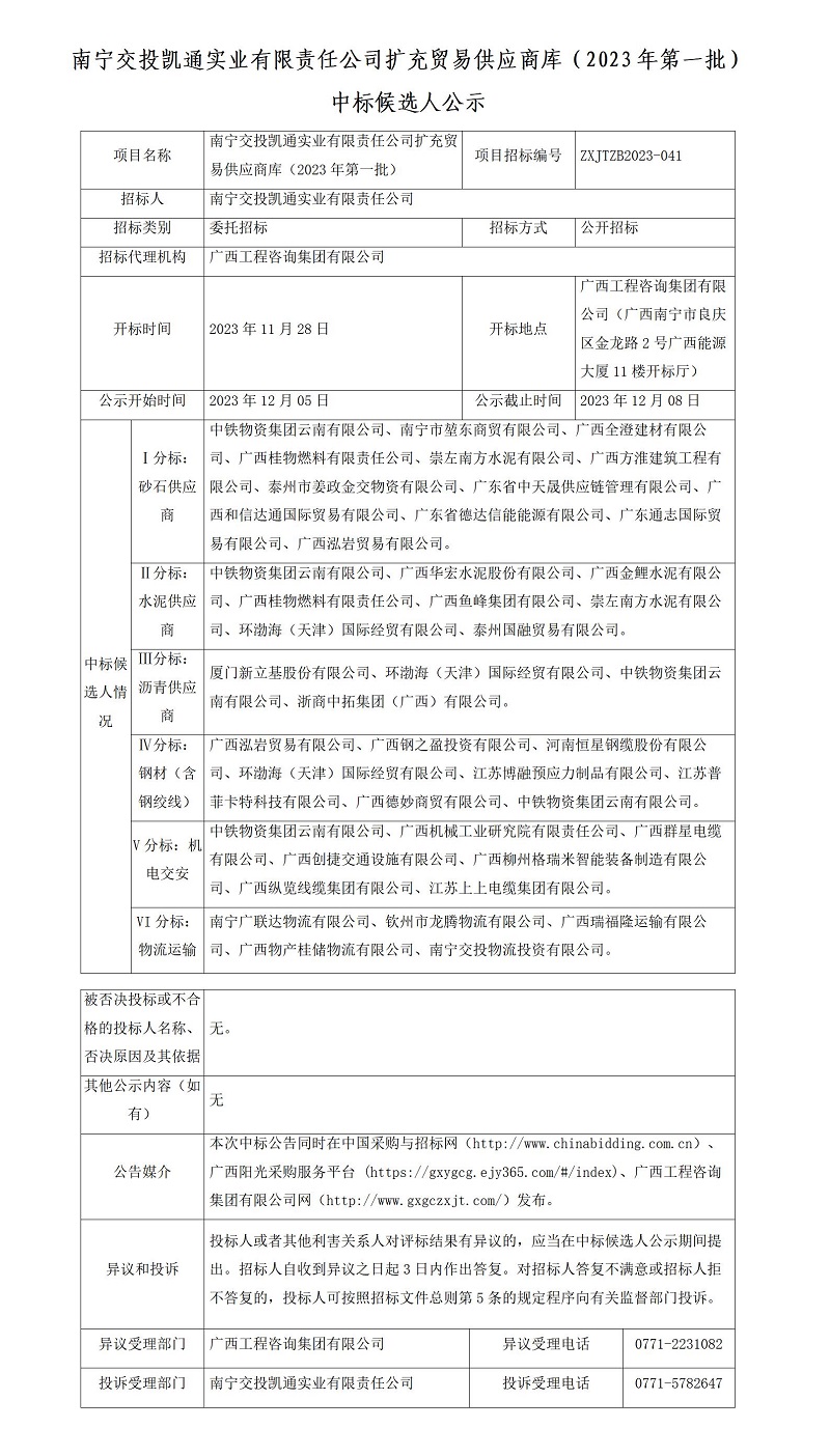 南寧交投凱通實業(yè)有限責(zé)任公司擴充貿(mào)易供應(yīng)商庫(2023年第一批) 中標(biāo)候選人公示